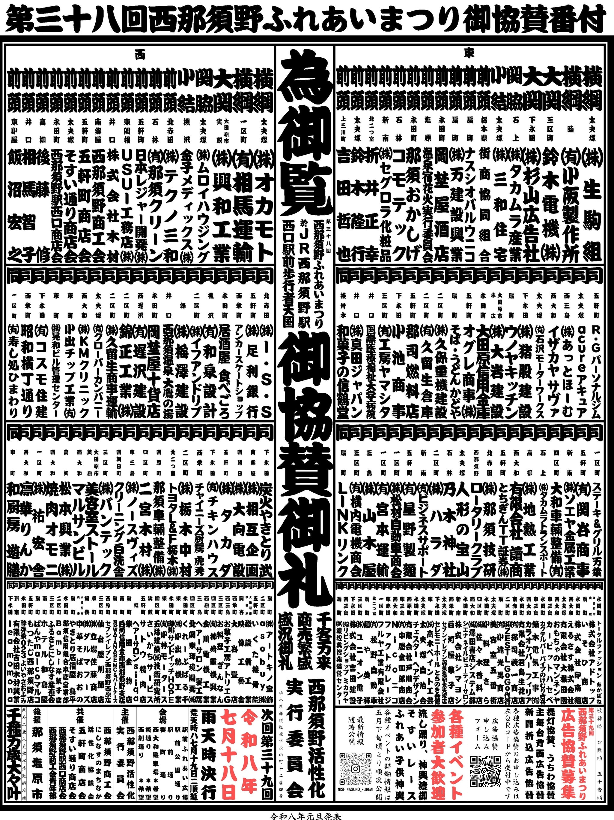 掲載媒体: 新聞折込(近隣3万部)、小中学校配布ビラ、会場内広告スペース ルール: 協賛口数順・五十音順での掲載となります。書体は統一(ロゴ不可)。 ※広告物のデザインは別添の番付表(第38回御協賛実績による見本)をご参照ください。